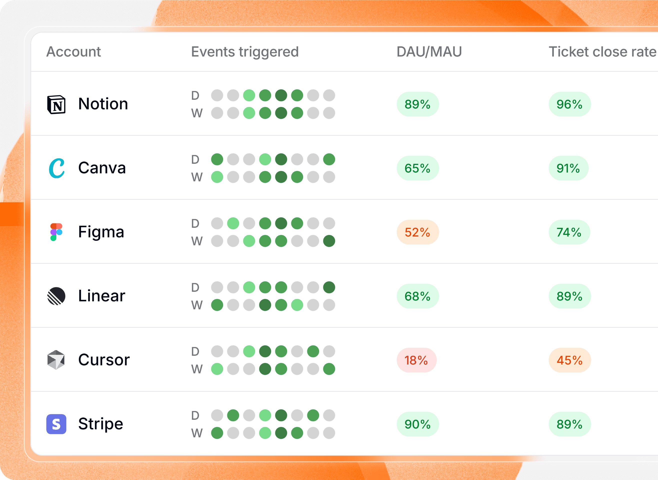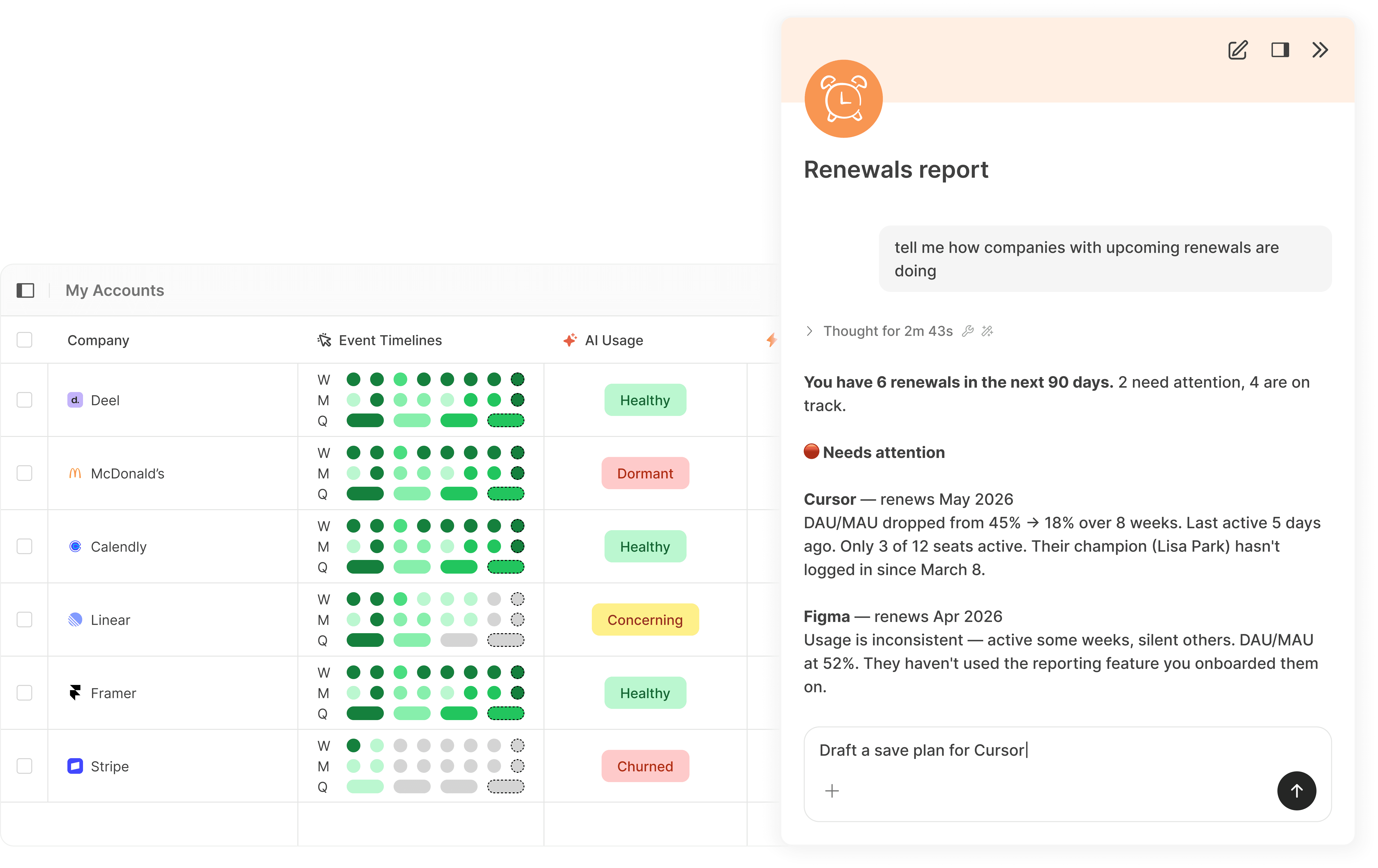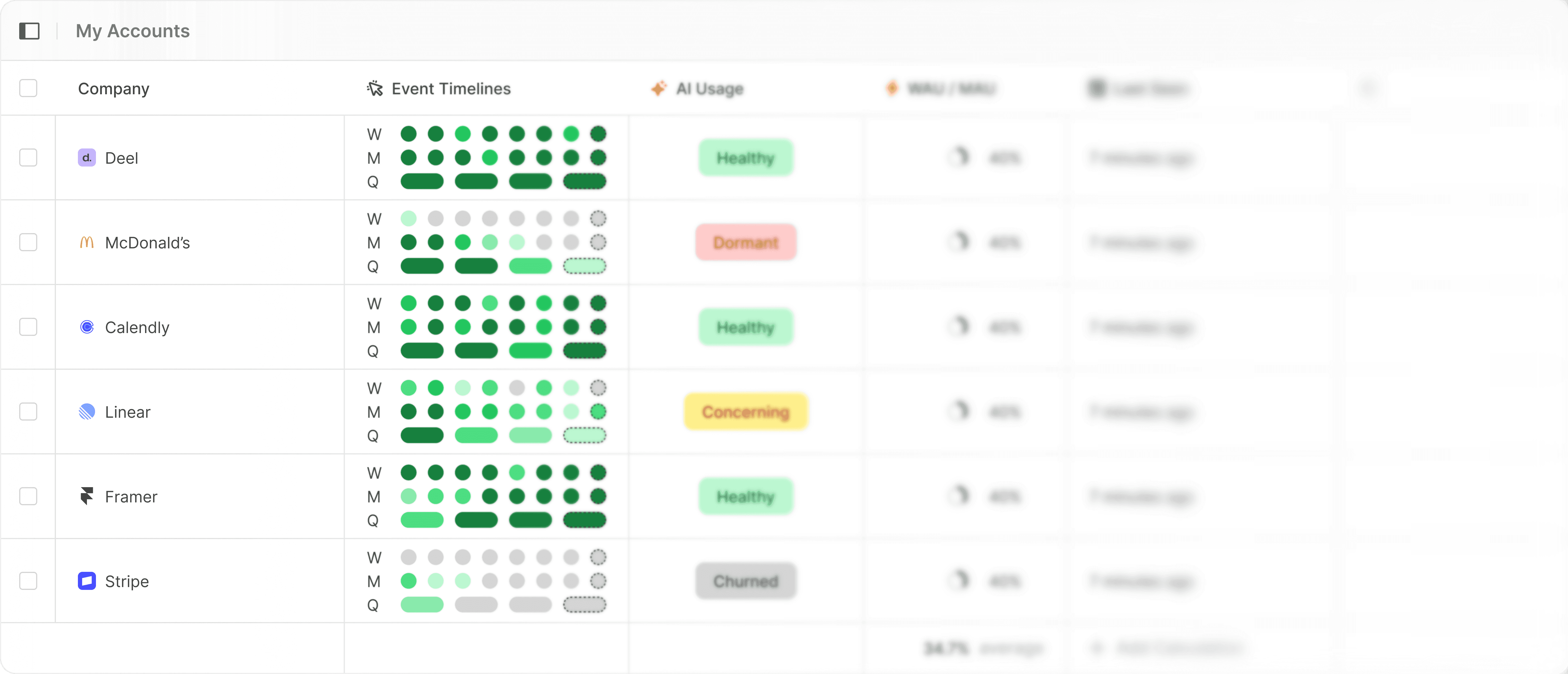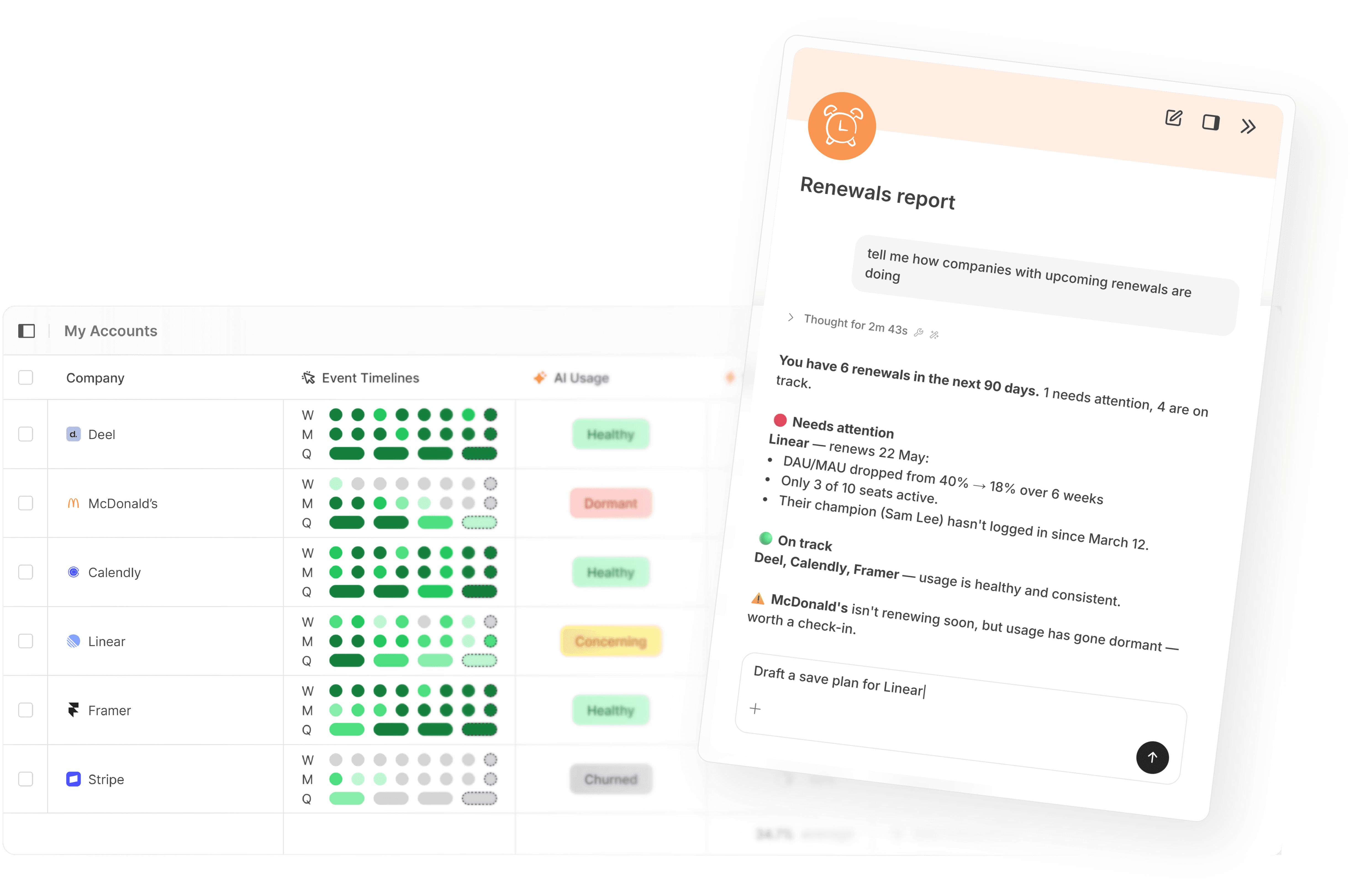 Feature adoption, seat utilization, usage trends — all in one view, at the account level where CS actually works. No more pulling data from three tools to understand one customer.