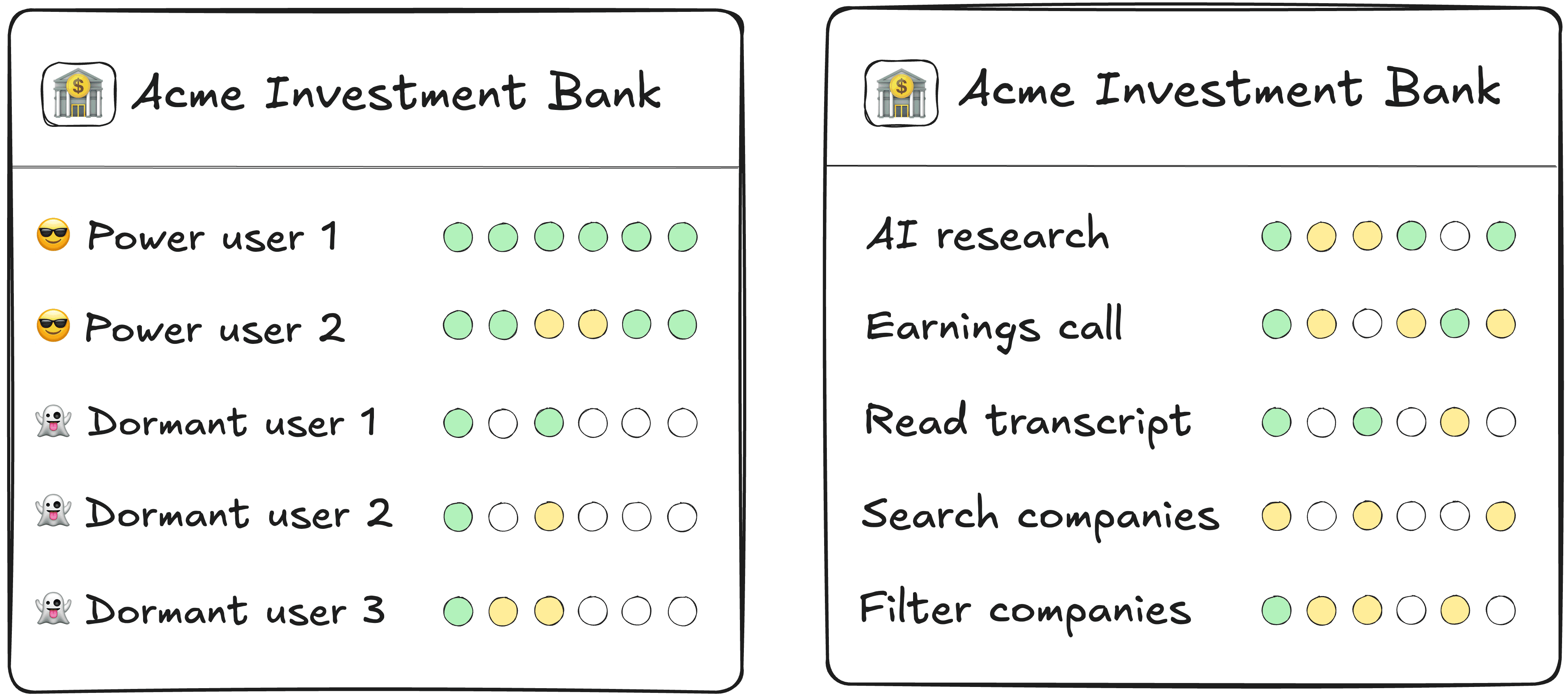 Userlens' Activity Dots visualize usage trends for users, accounts and features. The more green the dot, the more events have been triggered in the selected time period.